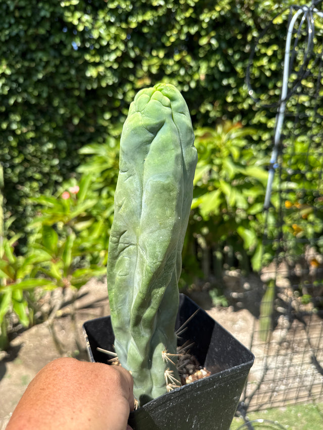 'Bruce's Dragon' is a highly sought-after cultivar of Trichocereus Bridgesii (also known as Echinopsis lageniformis), a columnar cactus native to the Andes Mountains, primarily Bolivia. It's particularly famous among cactus collectors for its unique and often "melty" or "notchy" growth patterns, which can be quite unpredictable and visually striking.
