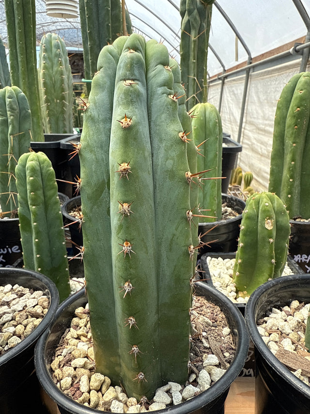 Kimnach- Kimnach comes from the Huntington Botanical Garden and is named after Myron Kimnach who was the director for a period of time. He collected the clone on the side of the road from Cajamarca to Namora in Peru in the 80's. (was assigned the collection number HBG 53196). Very glaucus and blue with short spines (max 2CM) Flowers are white and covered in brown hairs.