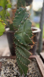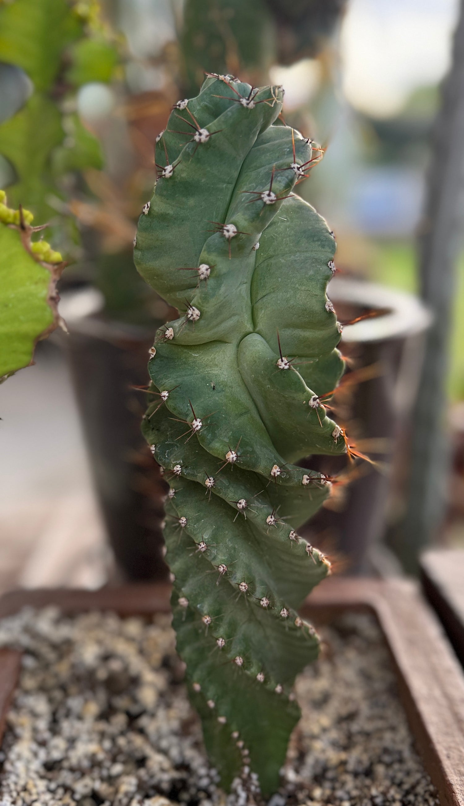 Widely known by the common name Spiral Cactus or Tornado Cactus. This distinctive plant is highly sought after in the landscaping community for its unique visual appeal, where its columnar stems grow in a mesmerizing corkscrew or twisting pattern. The plant in the photo is a young specimen that is beginning to show its characteristic spiral growth.